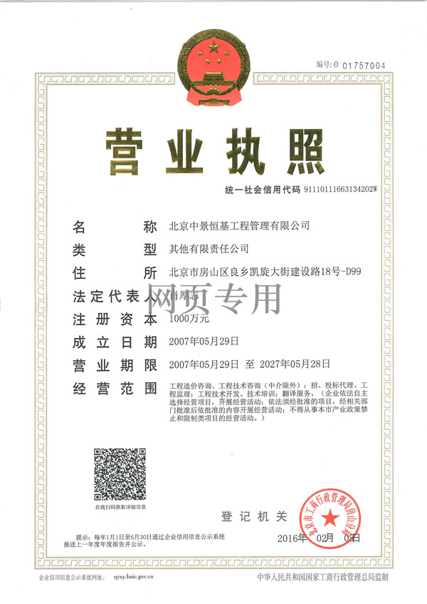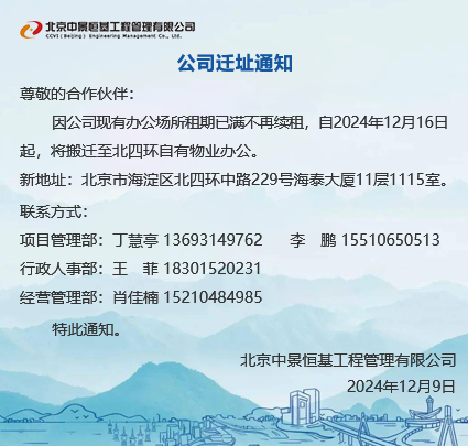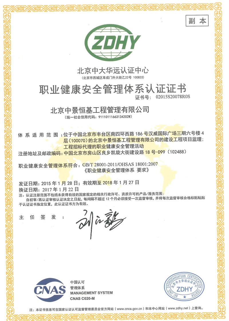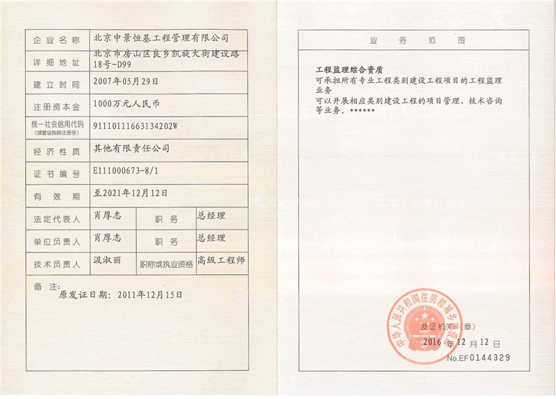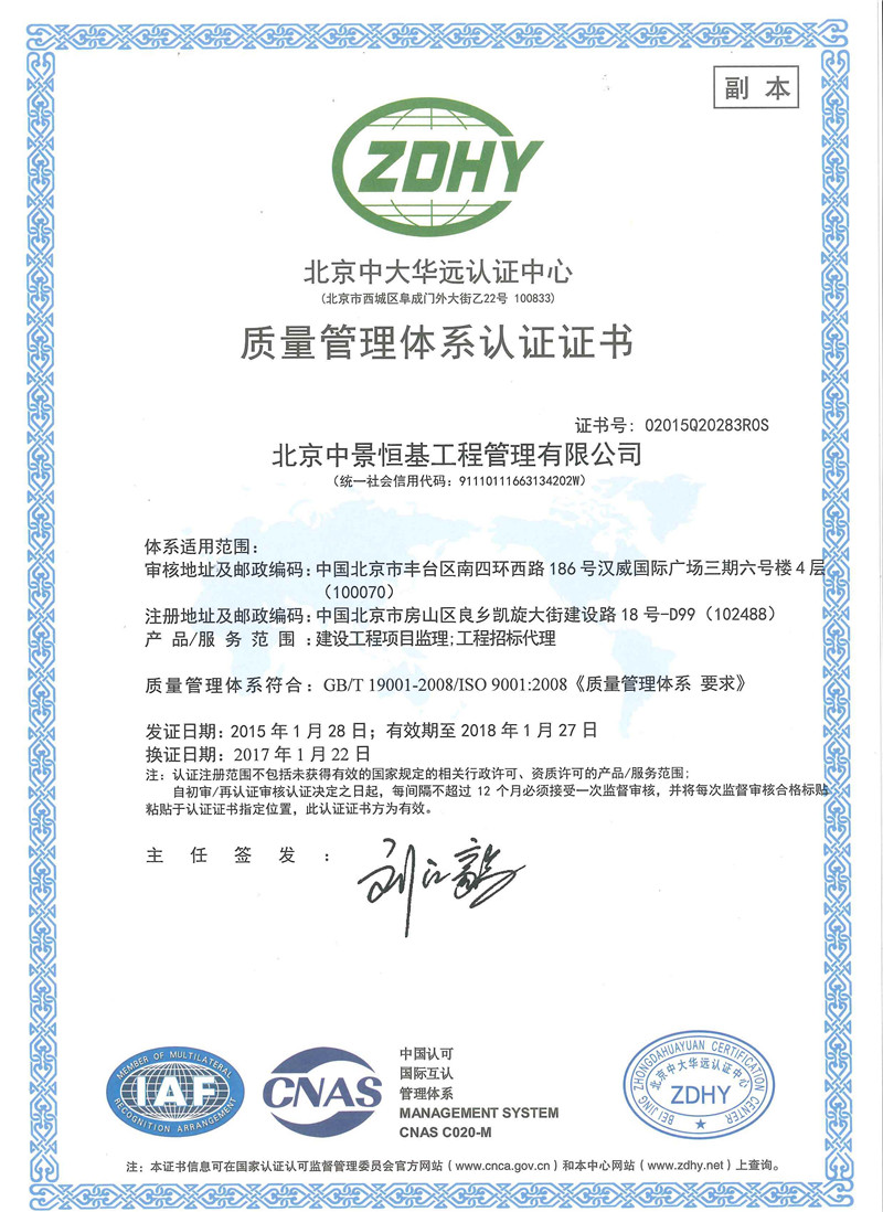 北京中景恒基工程管理有限公司(以下簡稱“公司”) 具有工程監(jiān)理綜合資質(zhì)、造價(jià)咨詢甲級資質(zhì)、水利工程、人防工程監(jiān)理資質(zhì)和工程招標(biāo)代理資質(zhì),是全國百強(qiáng)監(jiān)理企業(yè)之一。主要從事工程監(jiān)理、造價(jià)咨詢、項(xiàng)目管理、招標(biāo)代理等咨詢服務(wù) 業(yè)務(wù)。 公司自成立以來,始終注重自身建設(shè),強(qiáng)化內(nèi)部管理,形成了一套標(biāo)準(zhǔn)化、信息化、科學(xué)化的管理模式。率先通過了ISO9001質(zhì)量管理體系、IS...